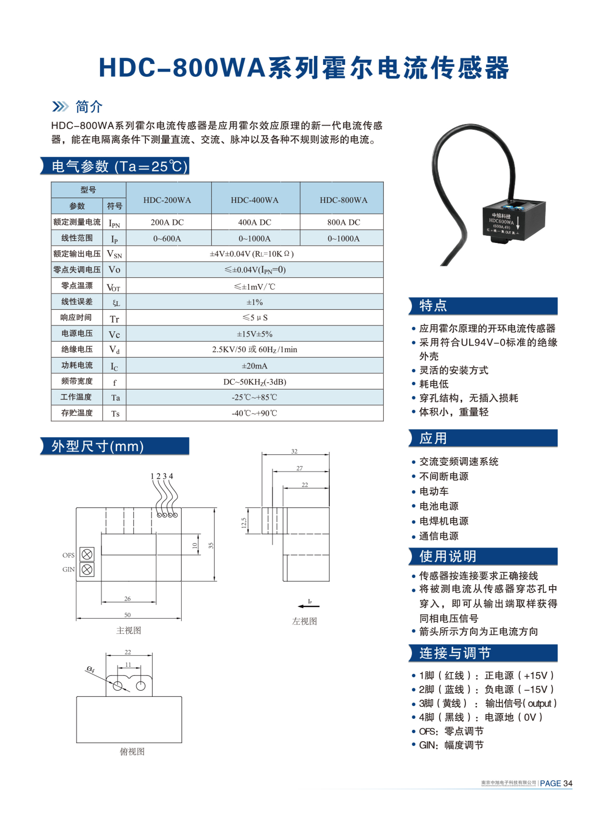 HDC-600WA series Hall current sensor is a new generation of current sensor using the principle of Hall effect. It can measure currents of DC, AC, pulse and various irregular waveform under electrical isolation.